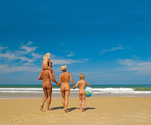 Семья нудистов на пляже